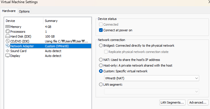 | NAT (VMnet8) | VMware가 가상 게이트웨이 역할을 하며, 게스트 OS가 NAT을 통해 인터넷 연결 가능 | ✅ 가능 |